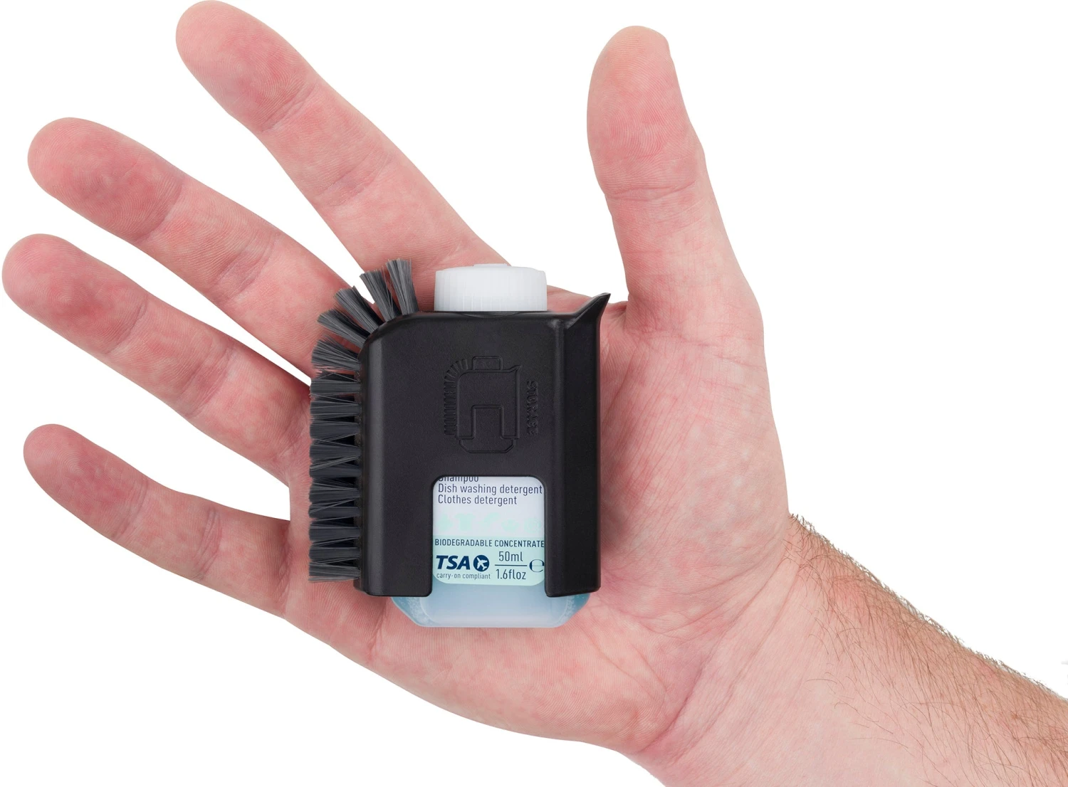 • Pratique et peu encombrant : Cette brosse à récurer avec bouteille de savon Wilderness Wash de 50 ml intégrée tient dans la paume de votre main