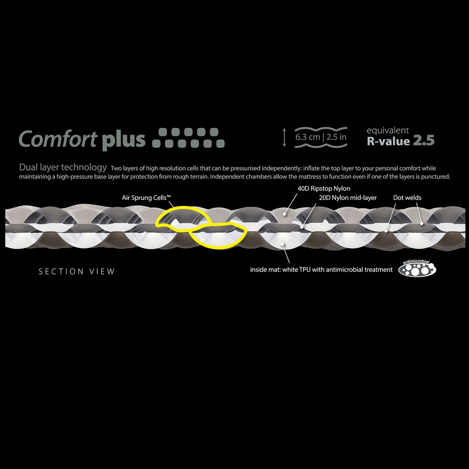 The Comfort Plus sleeping mats with their dual layer construction provide the most effective system for fine-tuning the level of comfort available in any air mattress today. The two independent high-resolution cell layers give excellent support by distributing your body weight and shape over more cells. The two layers are also offset for more uniform insulation and cushioning. Because the two layers can be pressurized independently, the top layer can be inflated to your personal comfort, while maintaining a high-pressure base layer for protection from rough or uneven terrain. Both layers can be adjusted independently using the fine tune valve to get just the right level of softness and support. All Sea to Summit sleeping mats come with a quality stuff sack, a repair kit containing six self adhesive patches for repairing punctures in the field, and a spare silicone one-way valve flap.