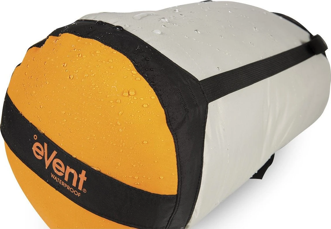 We were the first company to introduce a compression dry sack without a traditional purge valve. Air permeable eVent® fabric on the base allows air to be pushed out of the sack, while stopping water getting in: lighter, simpler and more reliable than a purge valve. The body is made of a tough 70D polyurethane coated Nylon. It has a non-wicking roll-top closure and a lid with four straps for even compression.