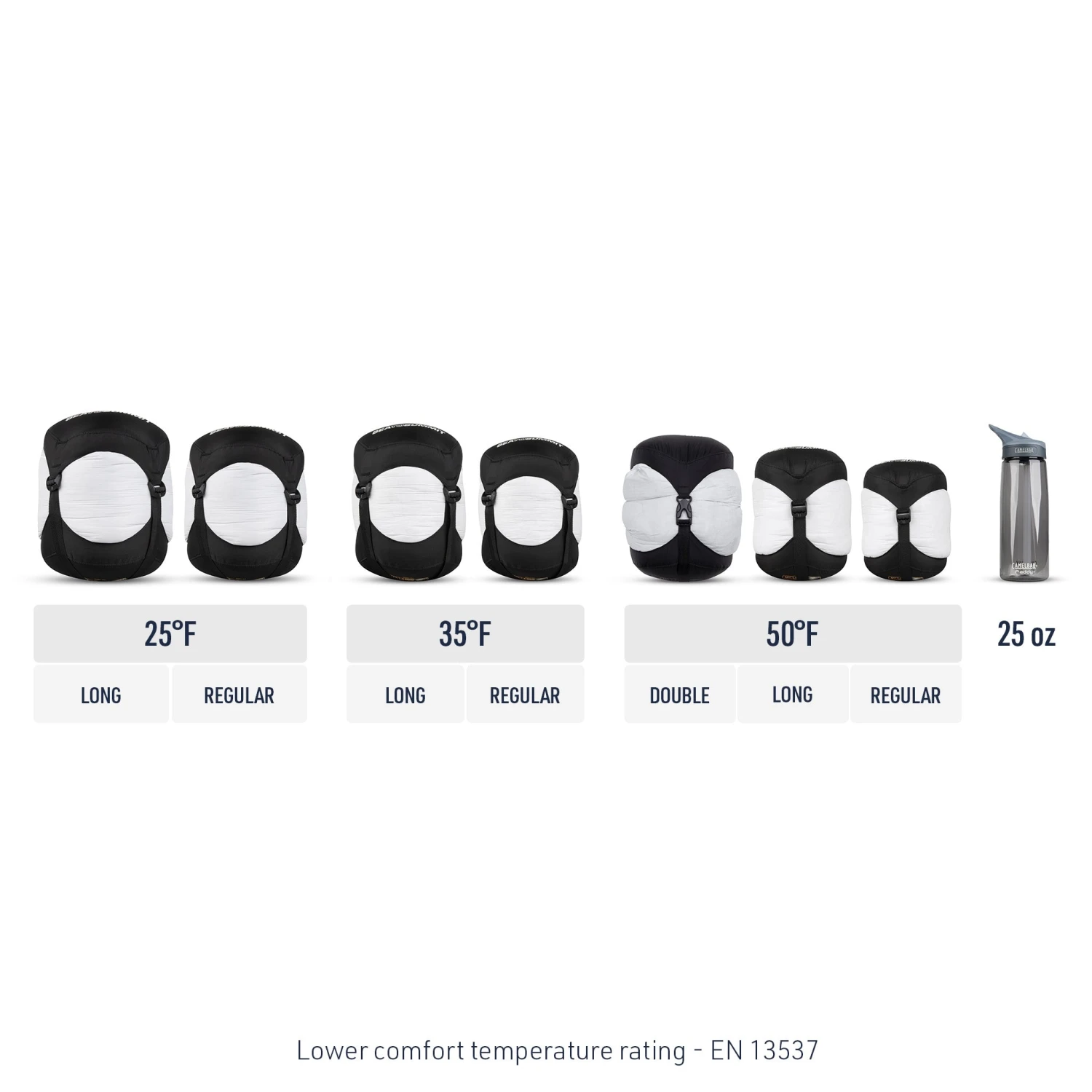 - Construction 50°F: Sewn-through construction. Drawcord in the foot section. Open up to a quilt or cinch tightly to create a ‘foot pocket’. 35°F: Box-baffles throughout. Drawcord in the foot section. Open up to a quilt or cinch tightly to create a ‘foot pocket’. 25°F: Box-baffles throughout. Sewn-in foot box which slips over the end of your sleeping mat.