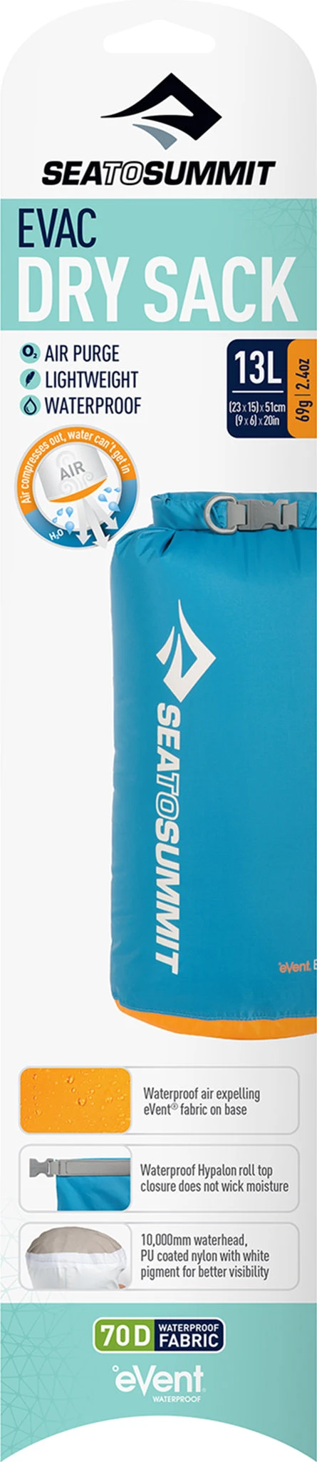 The eVac Dry Sack utilizes 70D lightweight nylon fabric for strength, and air-permeable eVent® waterproof fabric on the base. The eVent fabric lets you squeeze air out of the dry sack for more efficient space utilization inside a backpack. Pack your compressible items into the eVac Dry Sack, roll the roll-top closure down, then squeeze the sack to push the air out. Pro-tip: Sitting on a packed eVac Dry Sack is the best way to squeeze the air out-then pack the eVac Dry Sack into a tight space in your bag or pack so it does not draw itself full of air again.