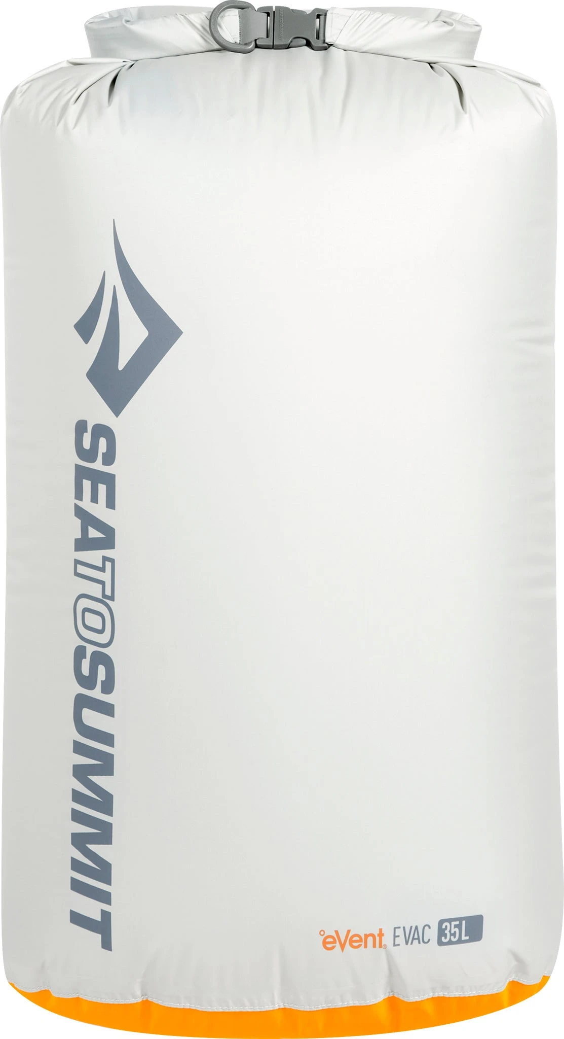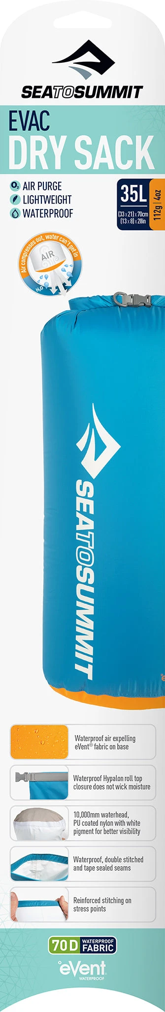 The eVac Dry Sack utilizes 70D lightweight nylon fabric for strength, and air-permeable eVent® waterproof fabric on the base. The eVent fabric lets you squeeze the air out of the dry sack for more efficient space utilization inside a backpack. Pack your compressible items into the eVac Dry Sack, roll the roll-top closure down, then squeeze the sack to push the air out. Pro-tip: Sitting on a packed eVac Dry Sack is the best way to squeeze the air out-then pack the eVac Dry Sack into a tight space in your bag or pack so it does not draw itself full of air again.
