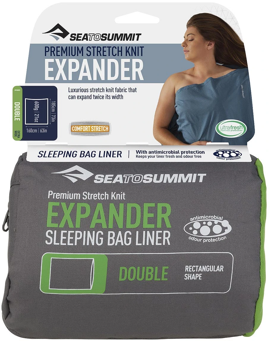 The Expander liner is made from a premium stretch knit poly-cotton, making it super stretchy and even warmer than a standard cotton weave liner. The stretchiness allows the Expander to move with you as you sleep, vastly increasing comfort and minimizing tangles. The anti-microbial treatment keeps microbial life, thus bad odors, at bay which also helps prolong the life of your liner and sleeping bag. The anti-microbial treatment won’t wash out of the liner and does not use nano-sized particles. The treatment is registered with the EPA.