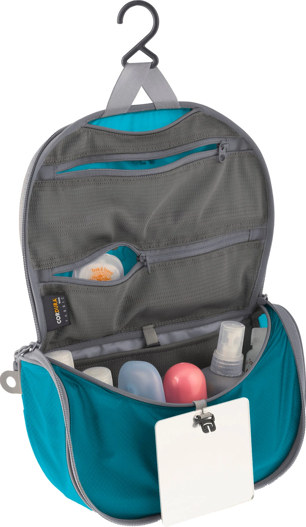 • Hanging Toiletry Bag Large 10 in x 9 in x 4 in 6 Liters 4 oz/112g|-|Trousse de toilette ultra-légère (79 g en taille S), crochet de suspension pour une plus grande facilité d’utilisation. Poche en mesh transparente pour trouver facilement le produit recherché, zip YKK avec renfort hypalon pour une ouverture facile et durable. Tissu Cordura avec coutures ultra SIL résistantes et étanches