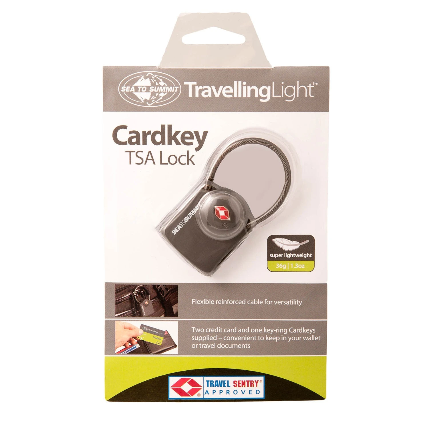 • A very lightweight lock with cable which uses a credit card and key-ring sized key-cards you keep in your wallet or travel documents.